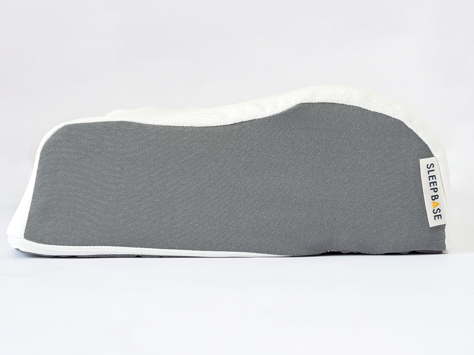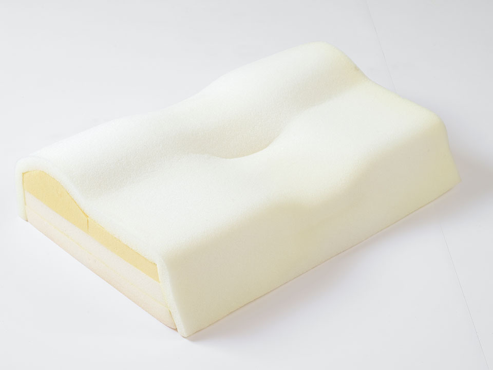ウレタン一種類だけだと、「寒暖差によって固さがかわる」、「包まれる感のあるものの沈み込みやすく寝返り打ちにくい」、「通気性がないから、湿気がこもりやすく蒸れやすい」、「ヘタリやすい」などの各素材の欠点が快眠の邪魔をすることが多い。それを素材の長所同士を組み合わせて欠点を消してよりよい快眠をもたらす構造にしました。しかも、いびきに効き、顔のむくみなどに対してもきくフォルムで、向きを変えれば、高さも変えられます。
